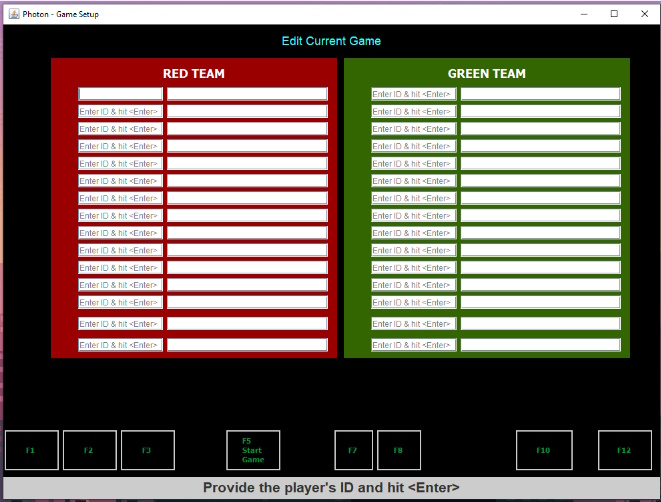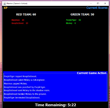 The Photon application was a course project for the Spring 2022 "Software Engineering" course. The objective was to create an application that resembled a similiar interface for Photon: The Ultimate Game on Planet Earth, the first lasertag arena. The application gives the user the perspective of a Photon operator, who would then input the names and player ids to the menu. Players are added to either a green team or a red team. After the teams have been made, the user can advance into a game. After a 30-second pre-game timer, the "game" will commence. The standalone application is not connected to any equipment (as there was none available), so the "game" is simulated using a python program. The python program selects two random players, randomly selects the interaction, and sends an encoded message to a UDP socket. When the UDP socket receives the message, it processes it and updates the scoreboard accordingly.